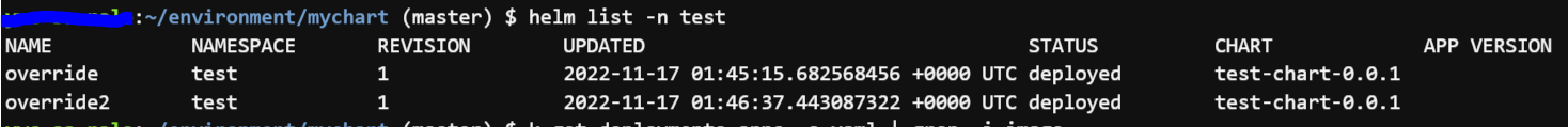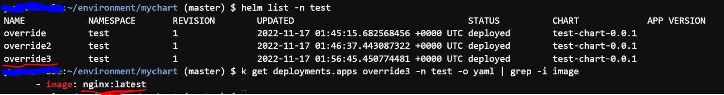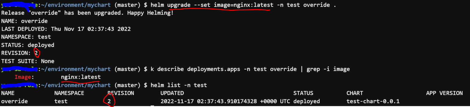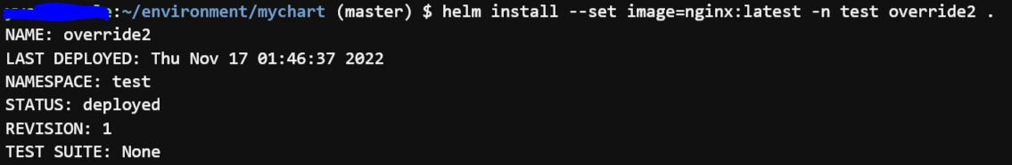 helm upgrade --set image=nginx:latest -n test override .