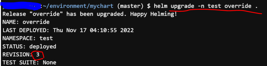 버전 2 -> 3으로 템플릿/차트.yaml 수정 후 upgrade -n test override .